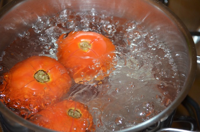 Mergulhe-os em água fervente por 30 segundos se não estiverem muito maduros e 15 segundos se estiverem maduros.