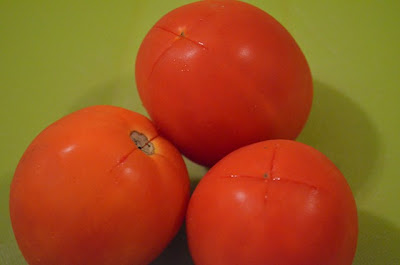 Com uma faca, faça cortes dos dois lados dos tomates para facilitar a retirada da pele.